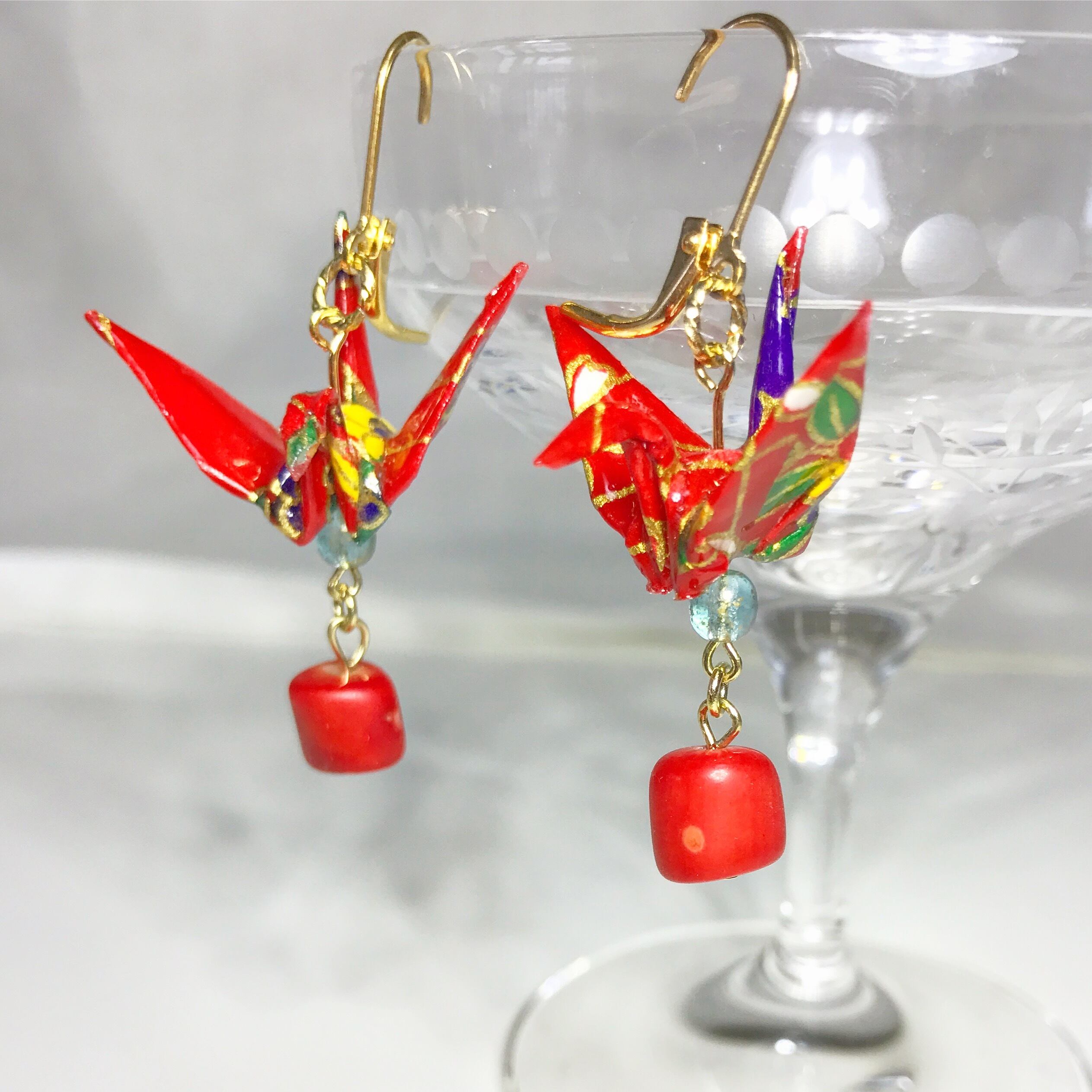 手すき友禅和紙を折鶴に天然石とハンドメイド。