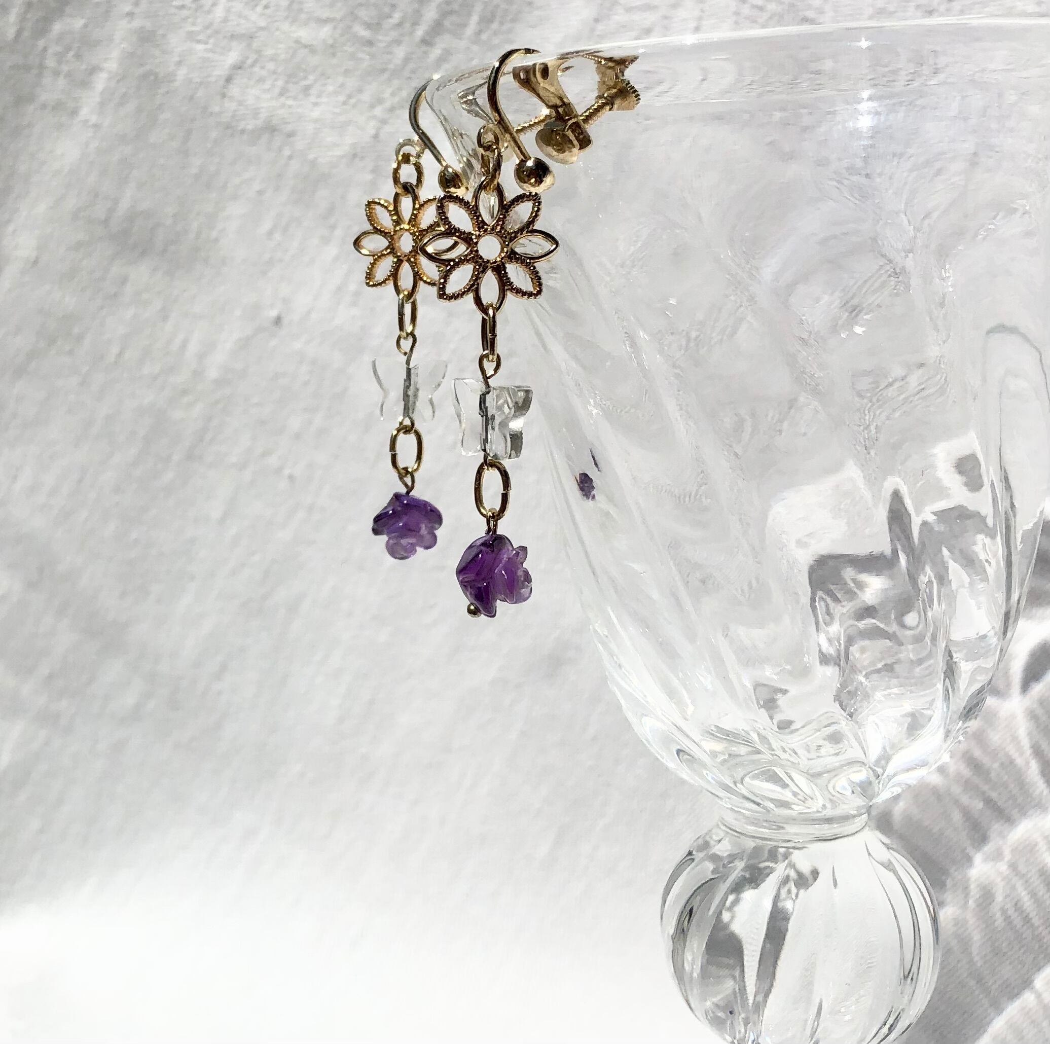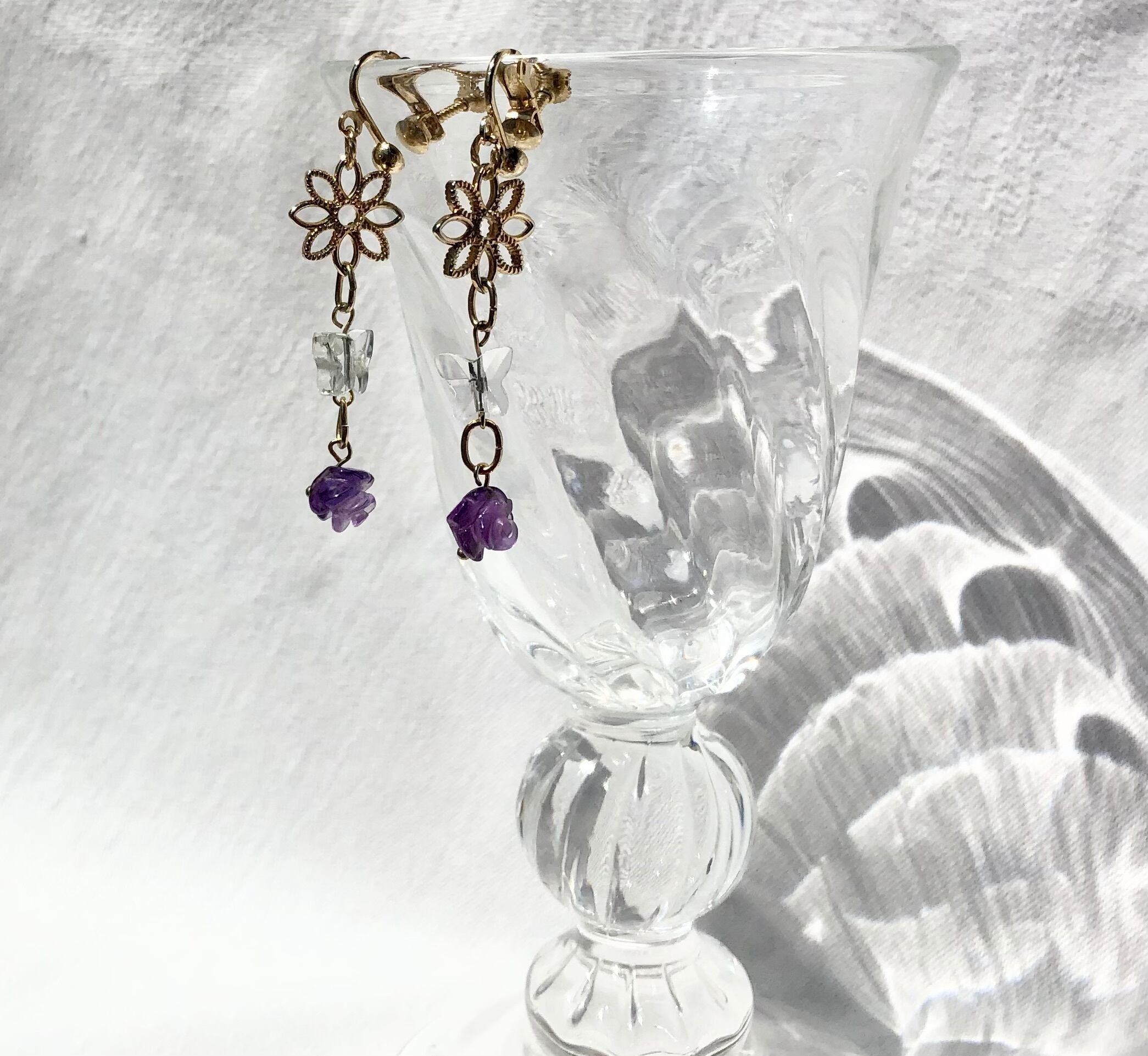 天然石薔薇アメジストとバタフライ水晶のイヤリング