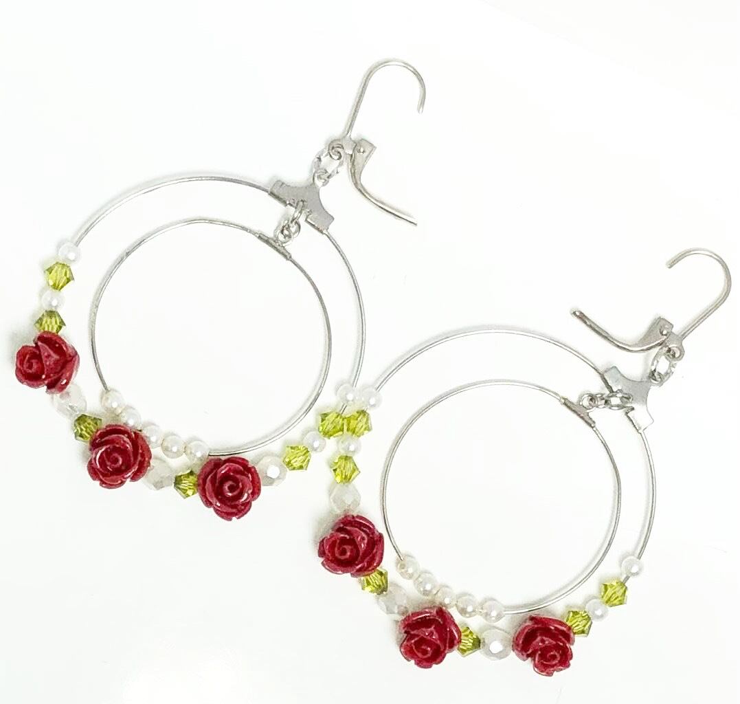 薔薇サンゴとスワロフスキーのピアス