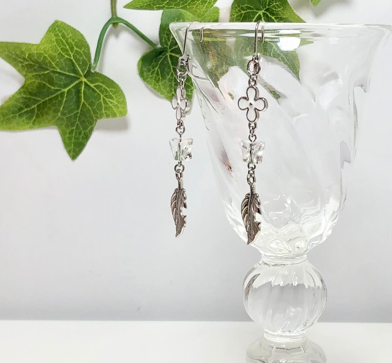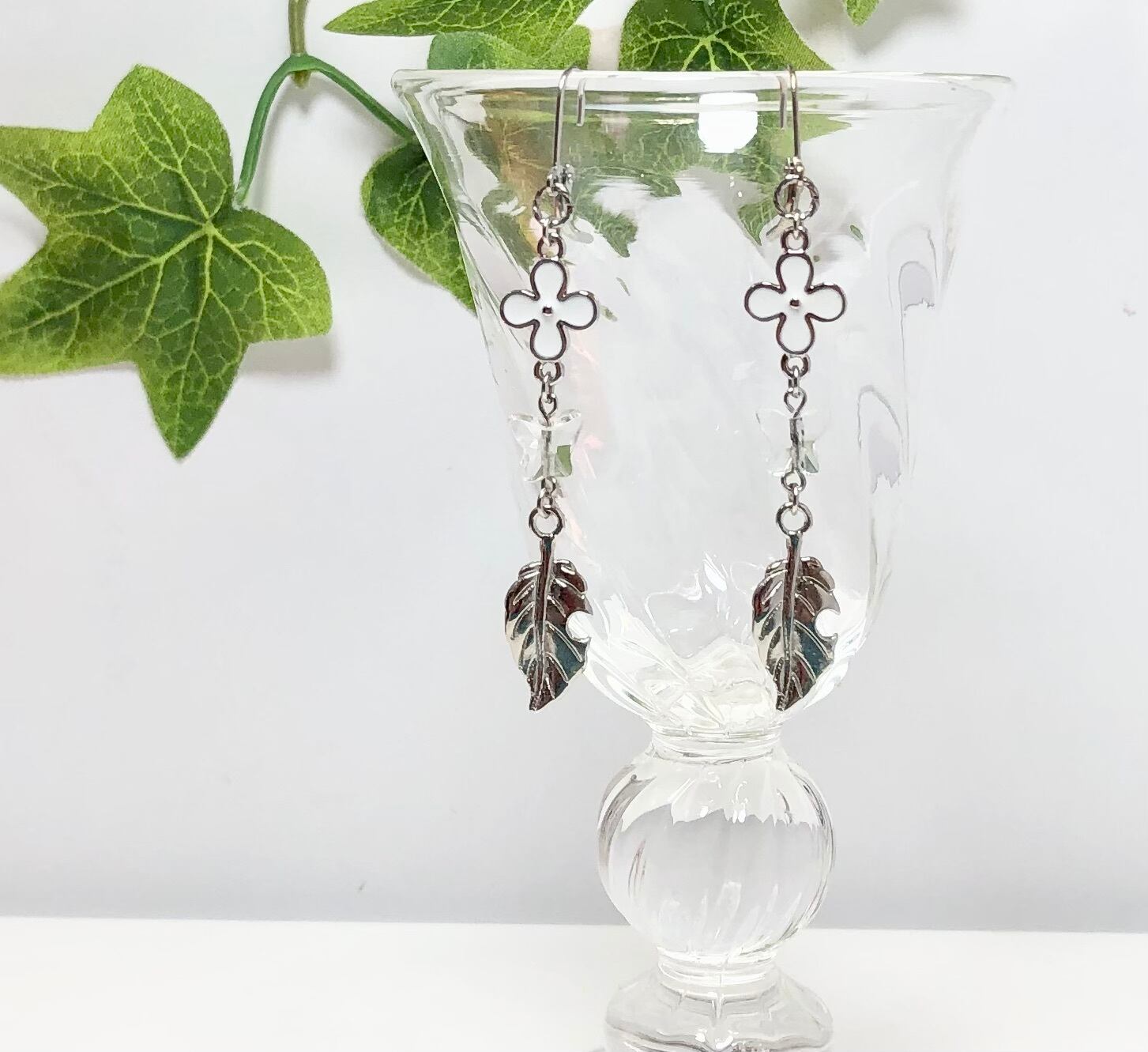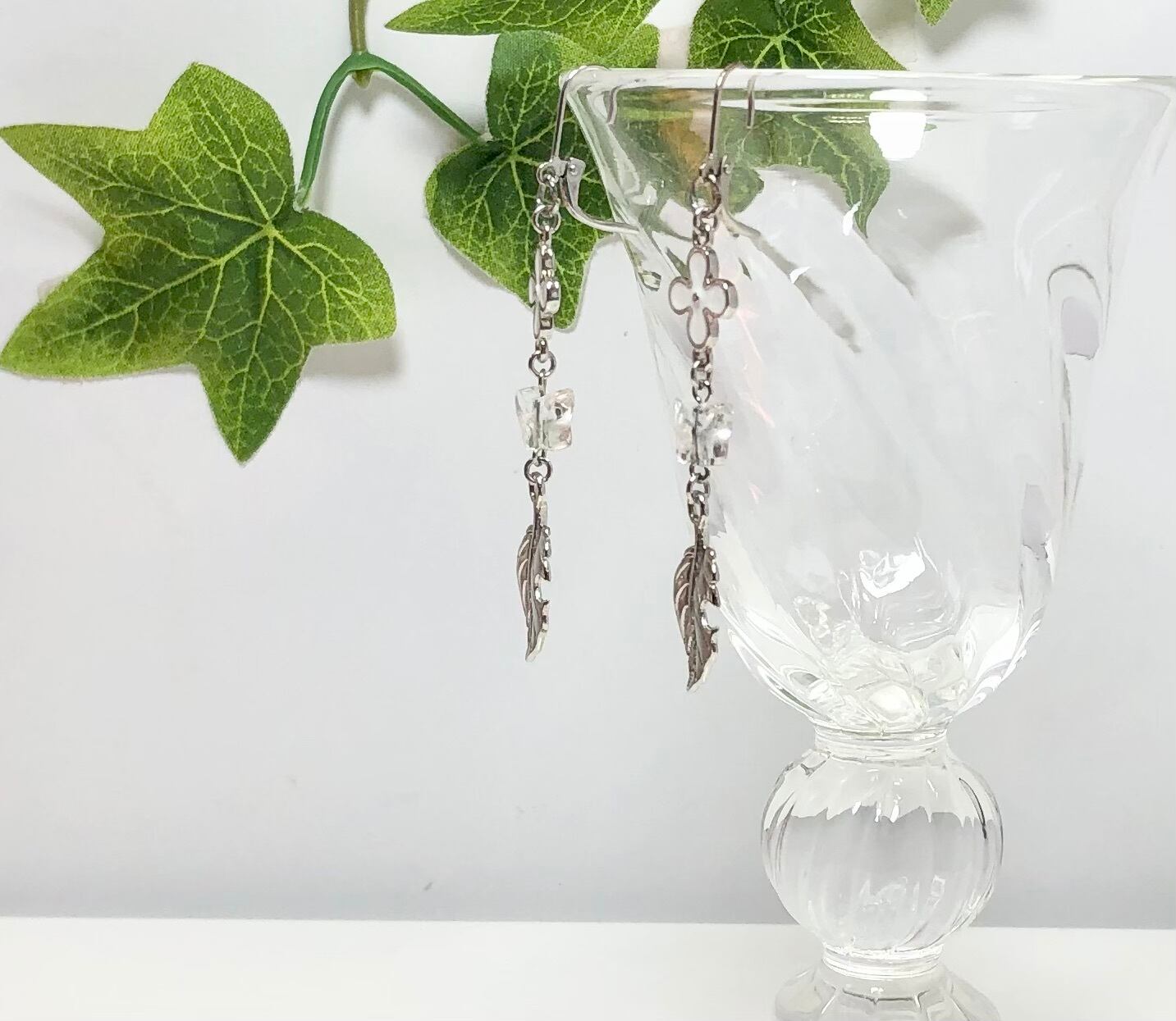 天然石バタフライ水晶とリーフのピアス
