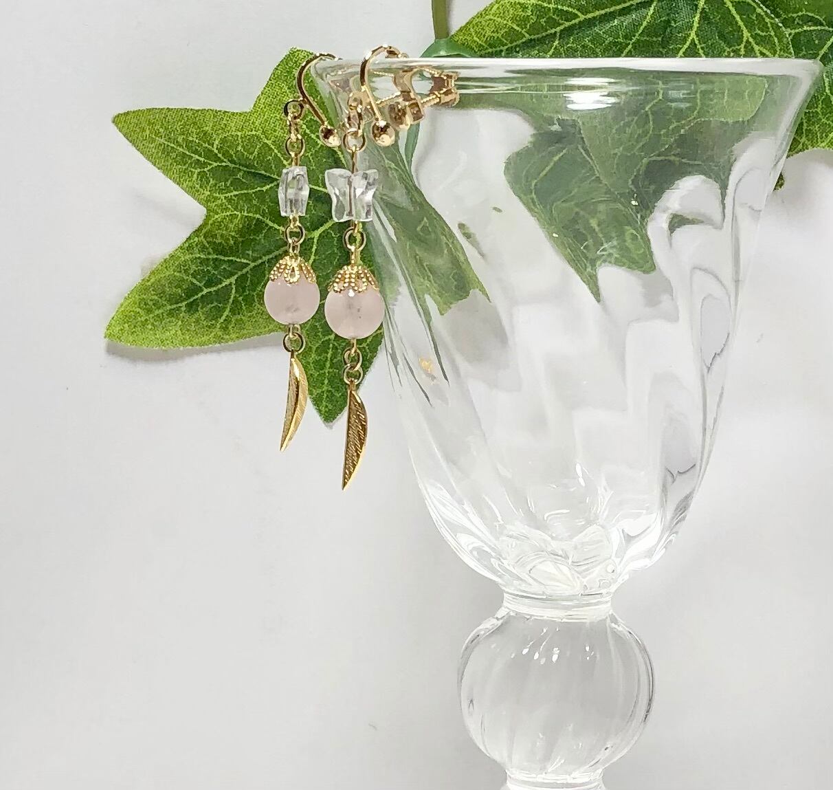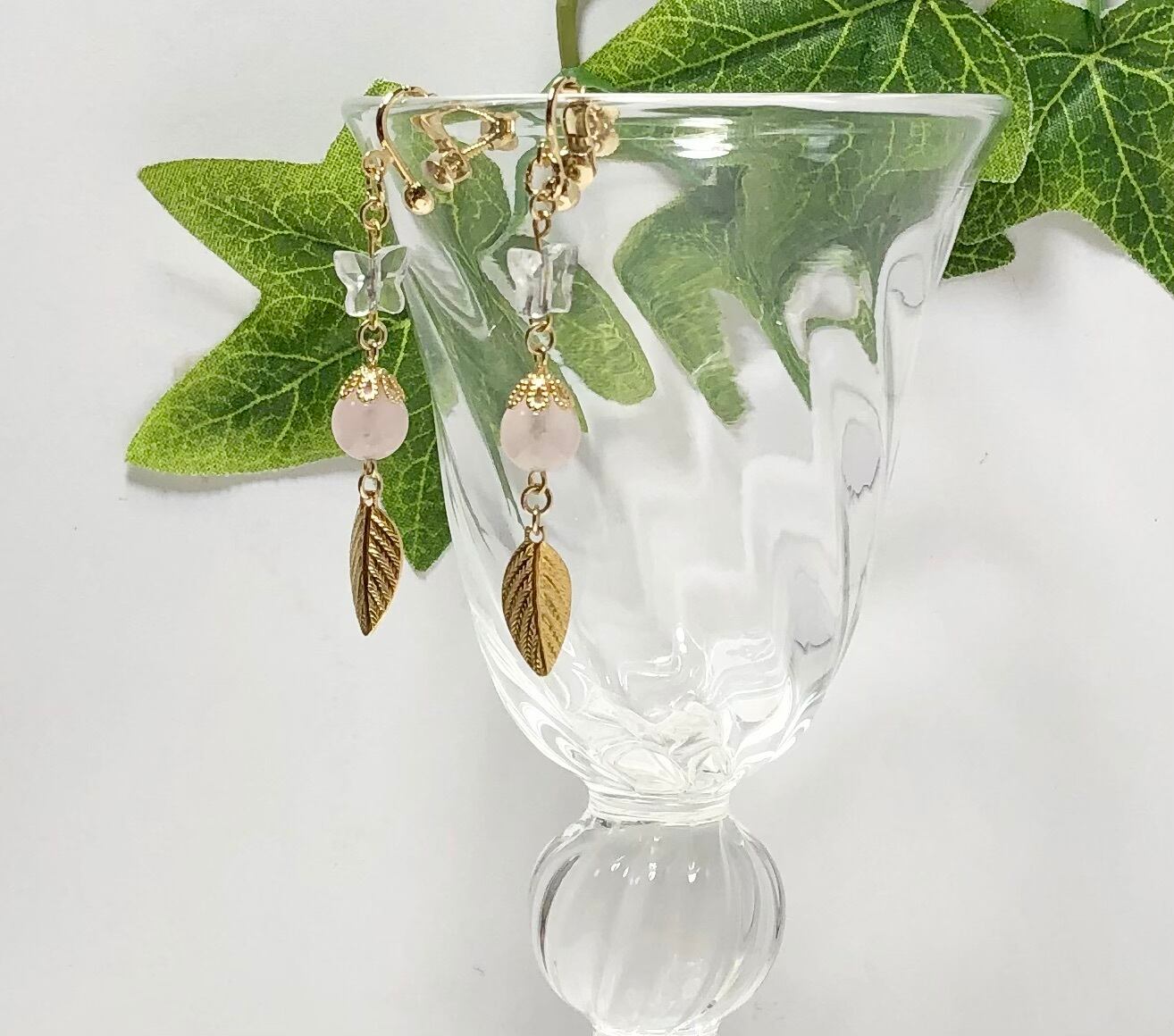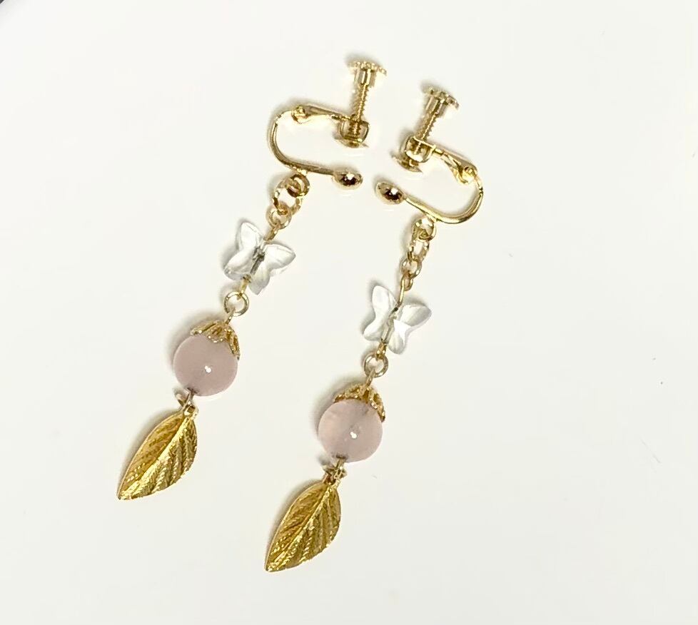 天然石ローズクォーツとバタフライ水晶のイヤリング