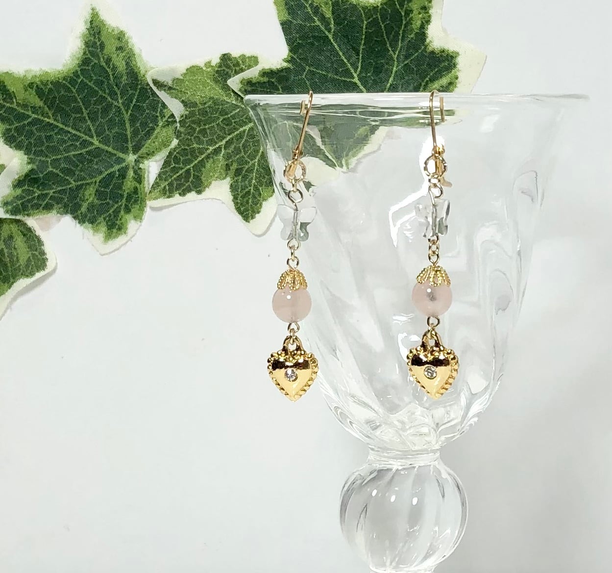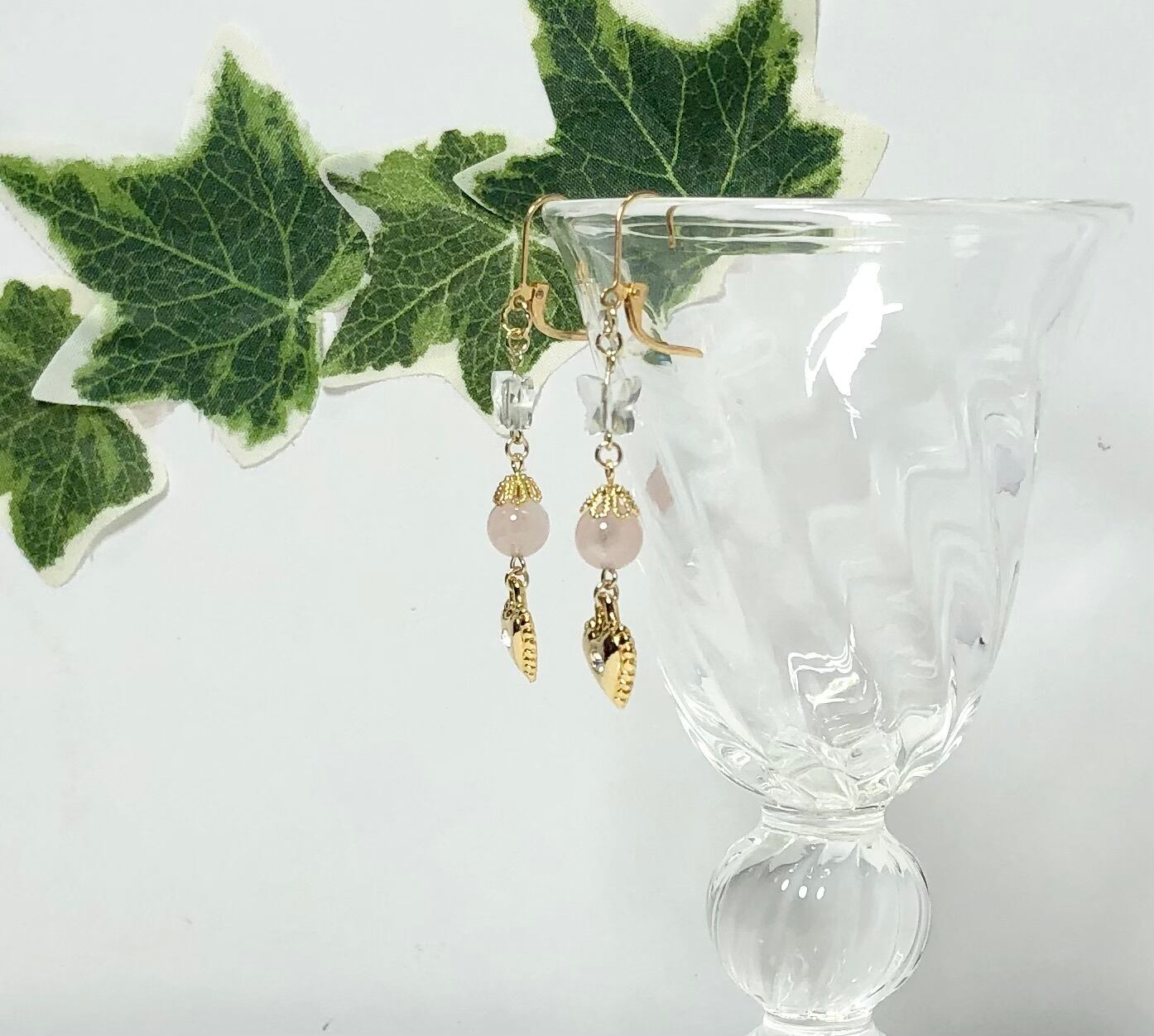 天然石ローズクォーツとバタフライ水晶とハートのピアス