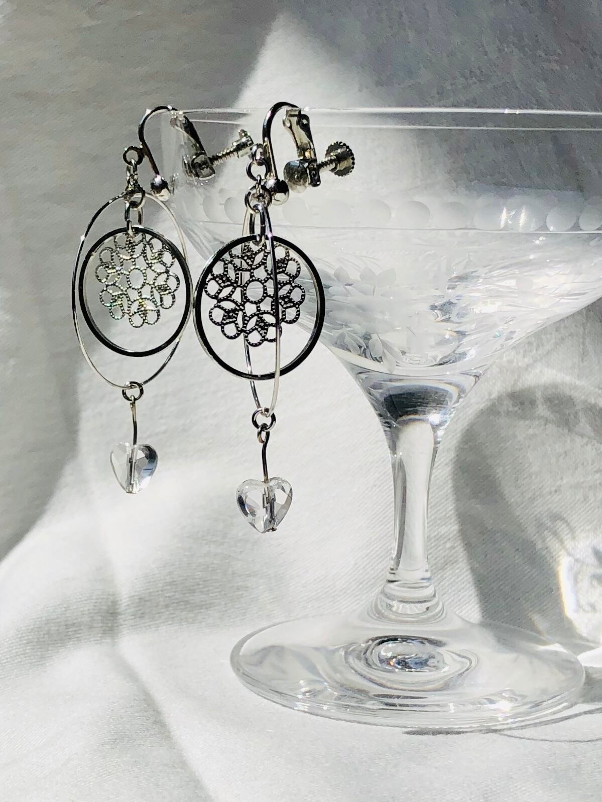 パワーストーン天然石ハート水晶と透かし模様のイヤリング