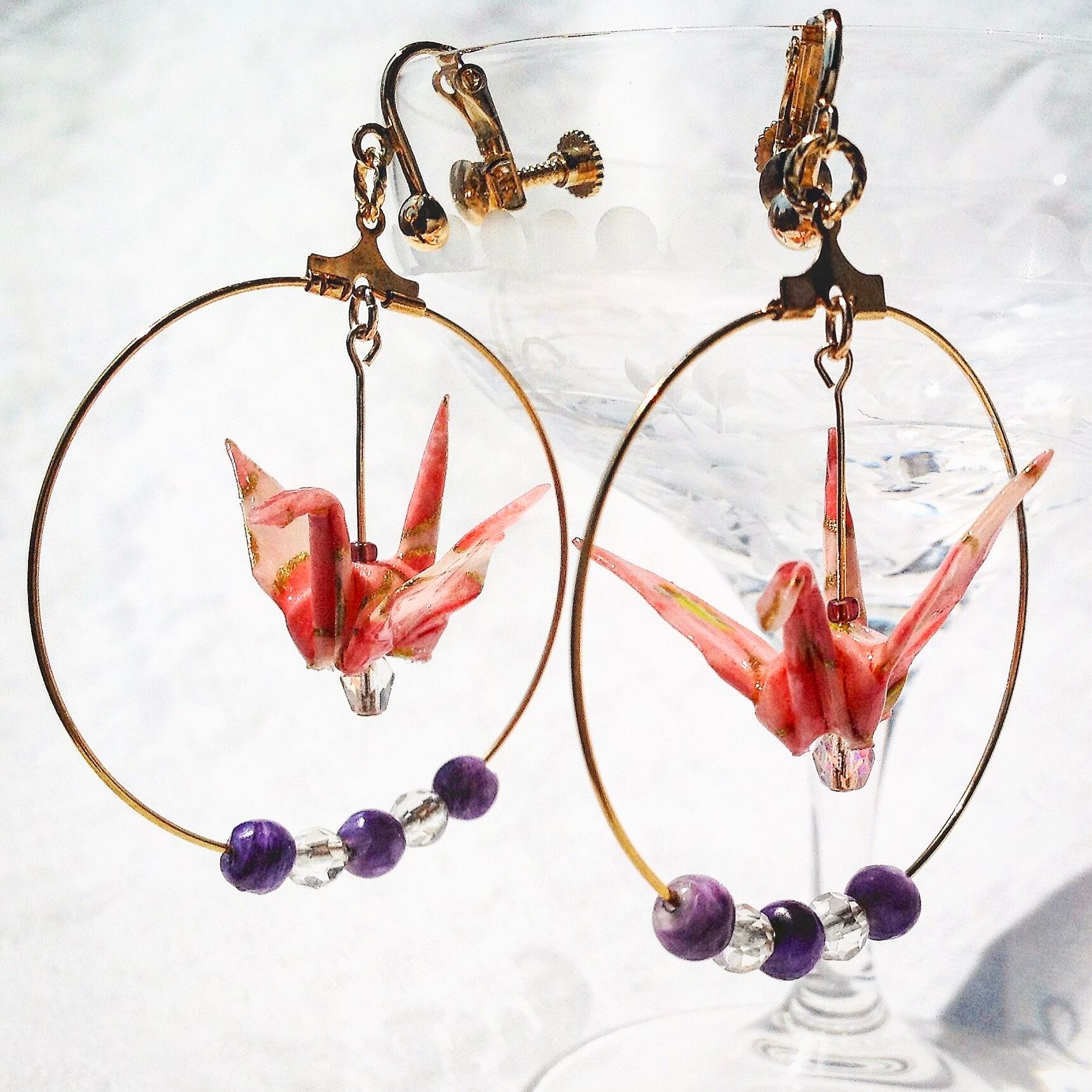 手すき友禅和紙で折鶴を世界三大ヒーリングパワーストーン天然石チャロアイトとハンドメイド。