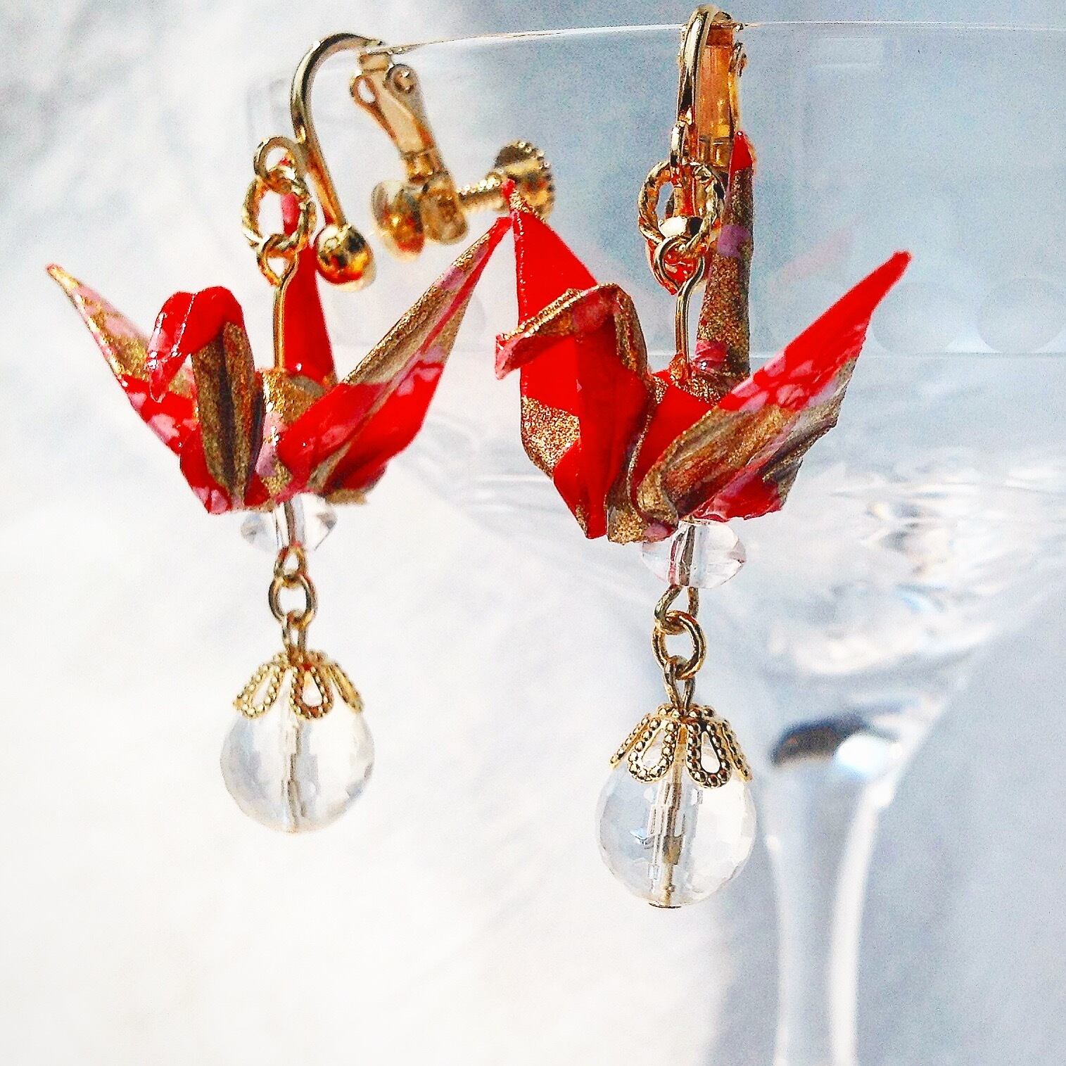 手すき友禅和紙で折り鶴を天然石とハンドメイド。
