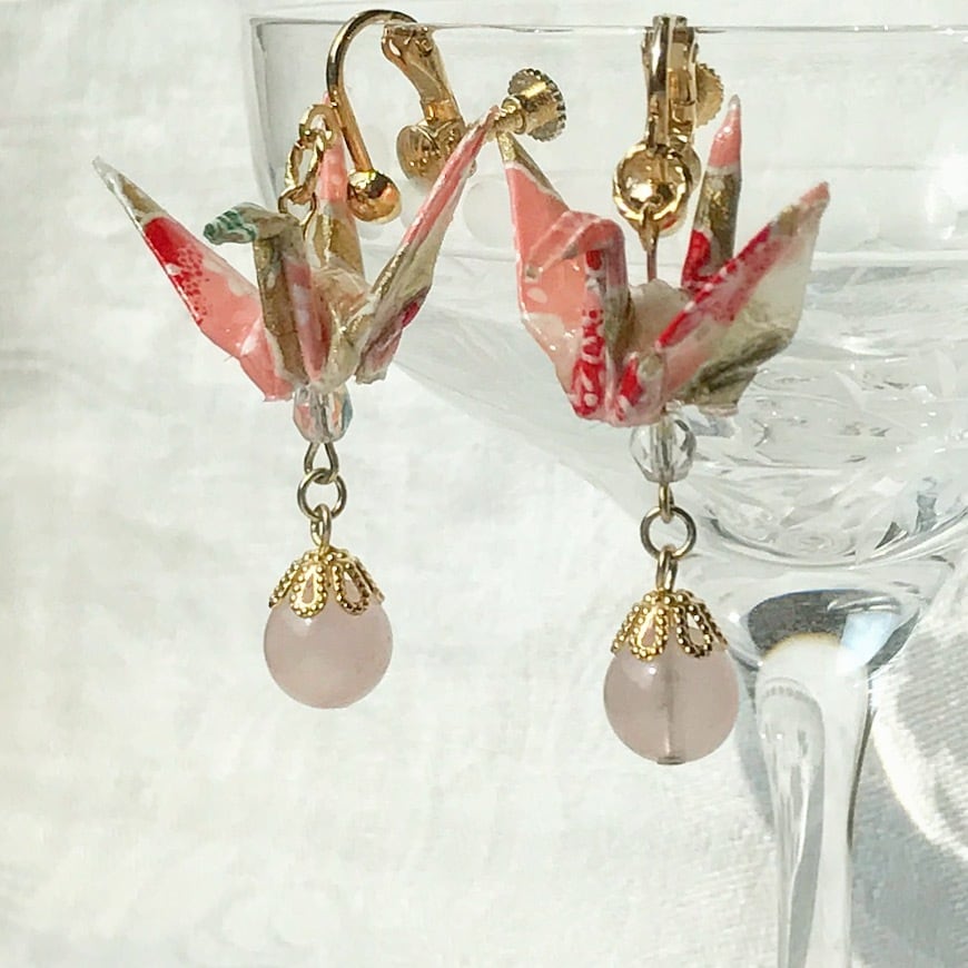 友禅和紙パワーストーン(ローズクォーツ、クリスタル)イヤ