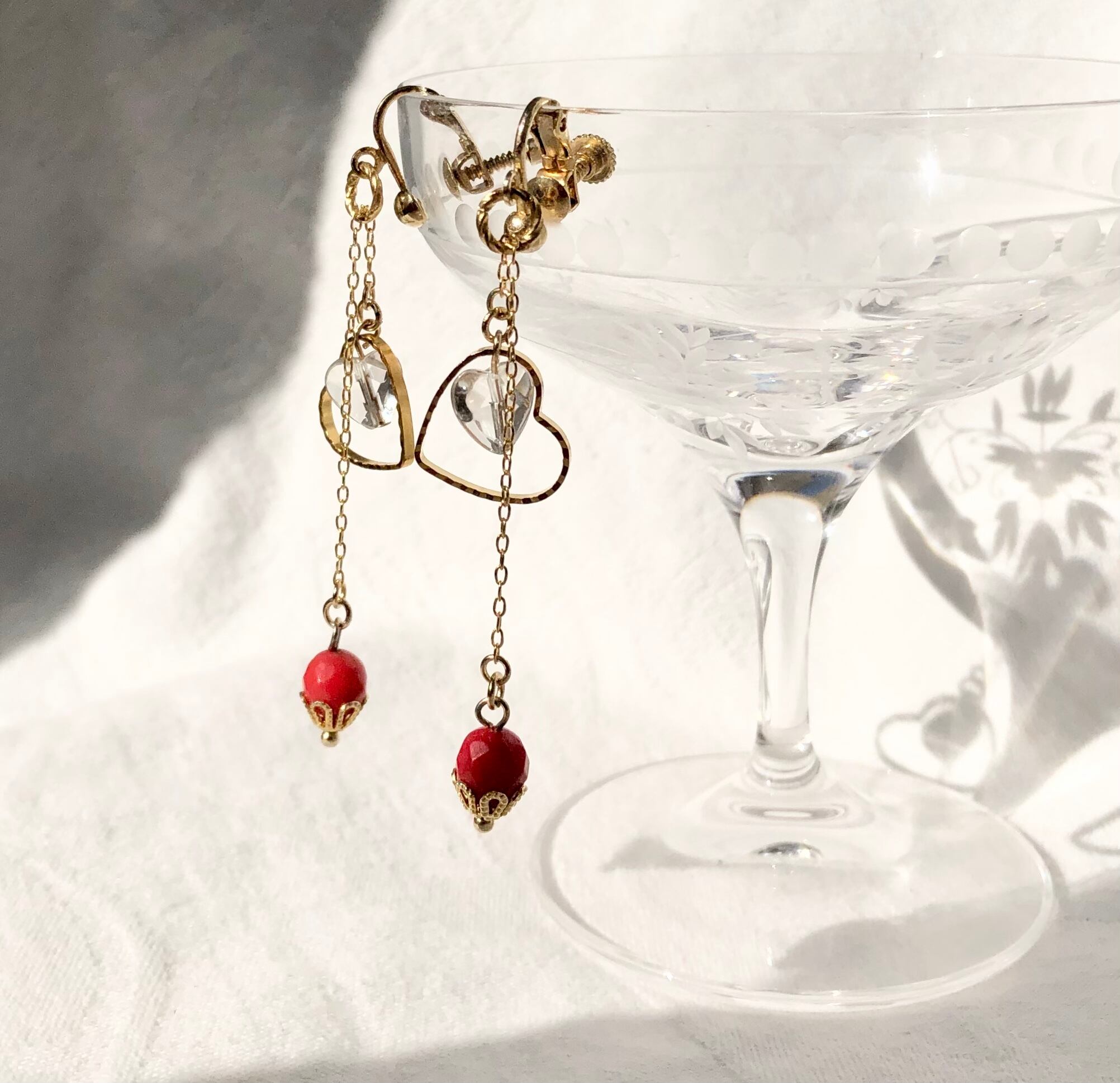 天然石サンゴとハート水晶のイヤリング