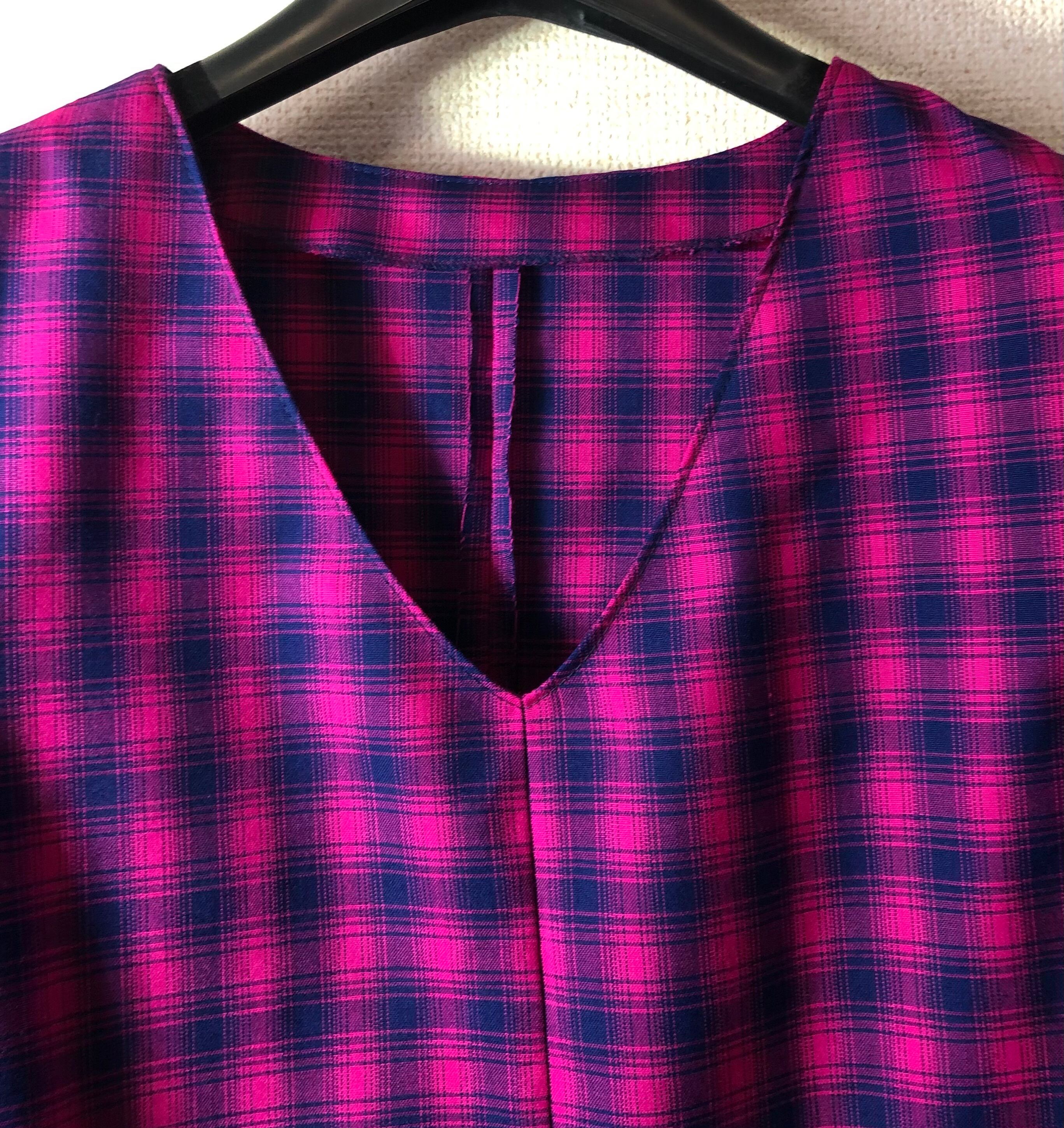 脇にタックを入れてVネックでスッキリ見えるようにしています。