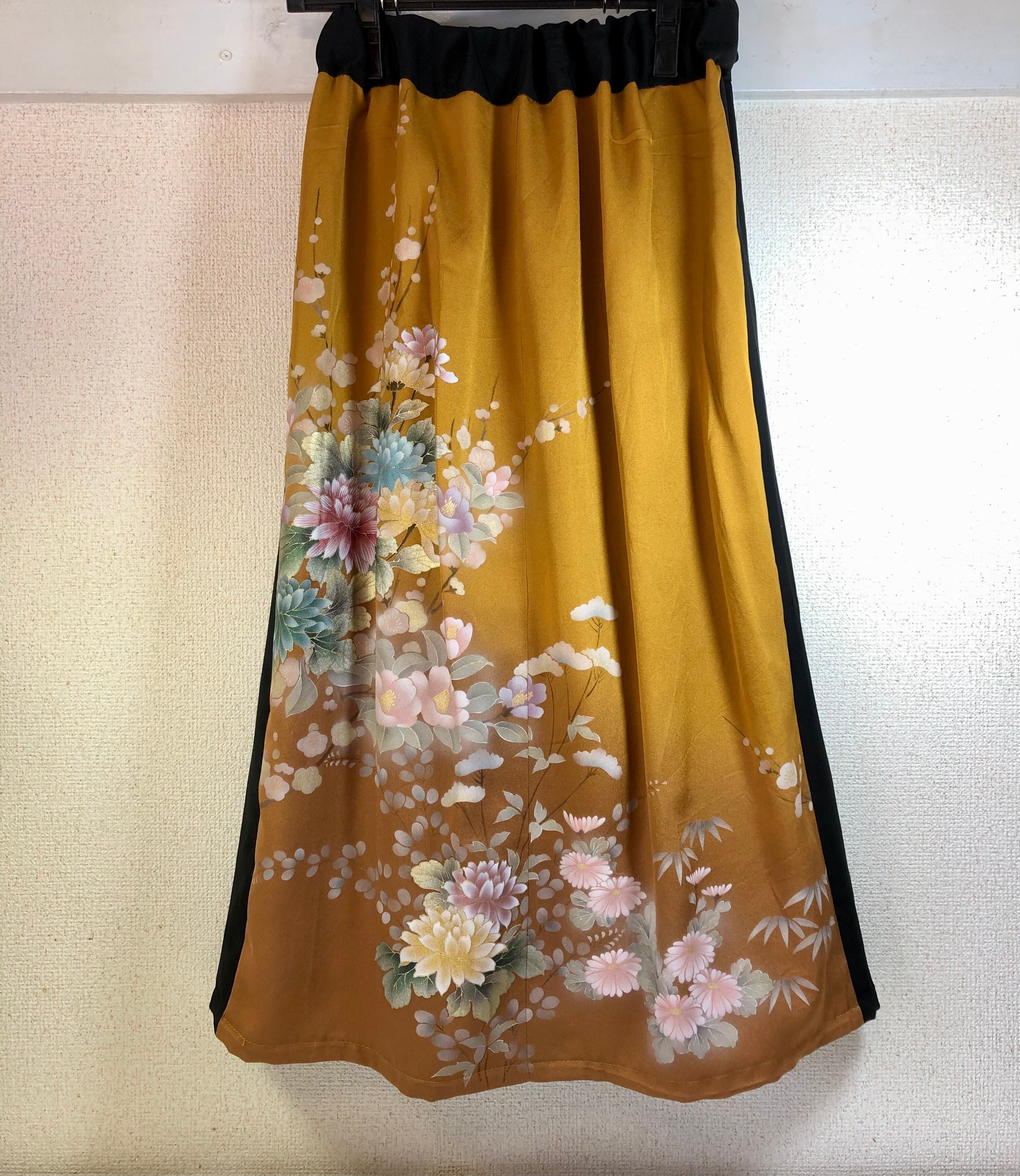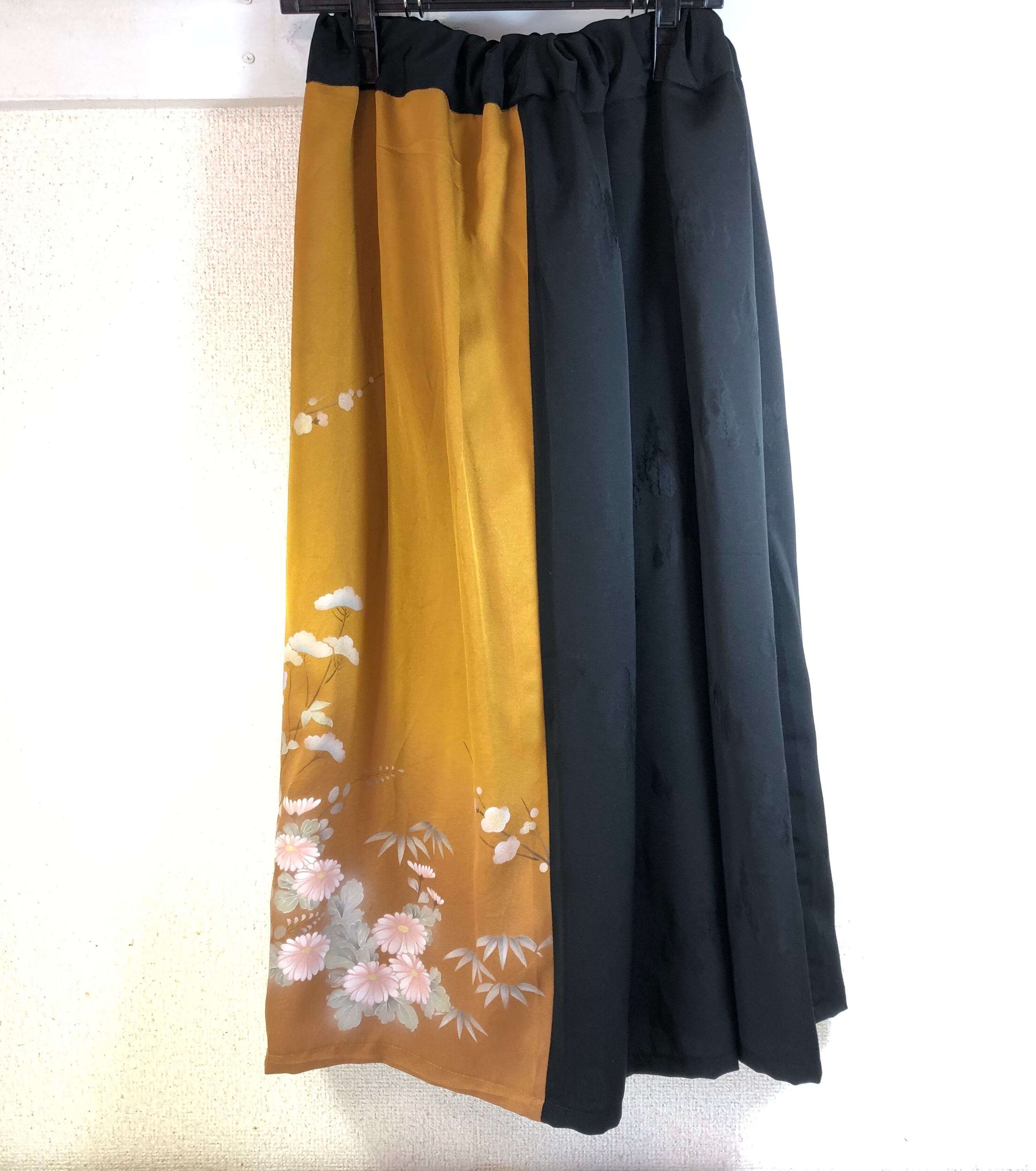絹付け下げ着物(金色)と絹着物(黒色木模様)を組み合わせリメイクしたプリーツギャザースカートです。